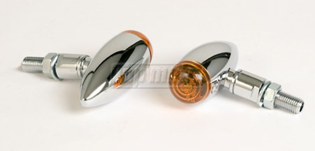 Blinkry MICRO-BULLET s dlouhou nohou, hladkým chromovým pláštěm a halogenovou žárovkou 12V/21W, žlutým sklíčkem. Homologované